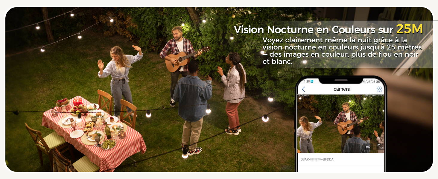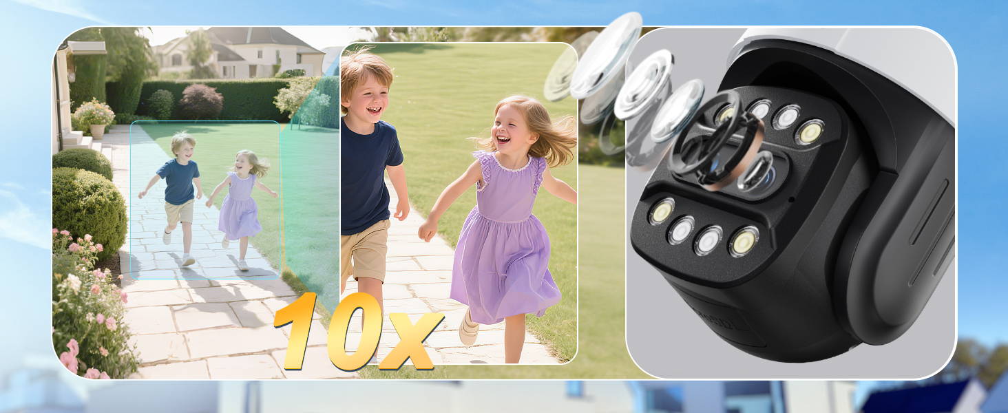 Le Zoom Hybride10X(Zoom optique 6X + zoom numérique 4X) vous permet d’agrandir visages, plaques d’immatriculation ou mouvements lointains sans perte de qualité — idéal pour allées, jardins, entrepôts, etc.