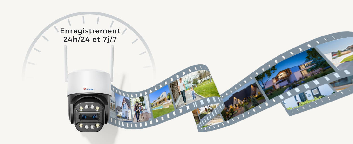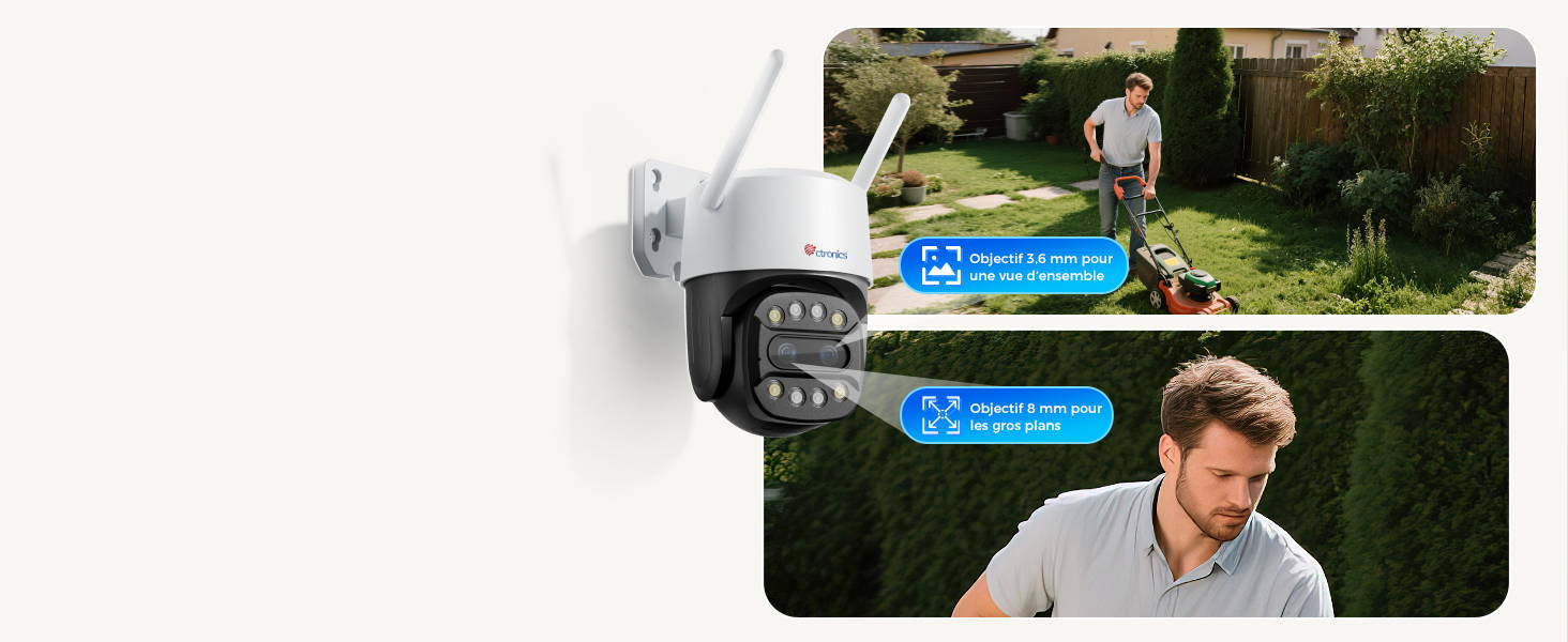 Ctronics caméra de sécurité extérieure est équipée d’un système à double objectif permettant de surveiller à la fois de larges zones et des détails précis.